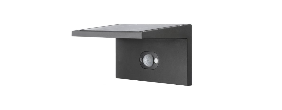 Aplique de pared para exterior. Funcionamiento mediante energía solar, no requiere conexión eléctrica. Sensor crepuscular y de movimiento.