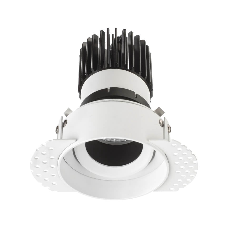 Empotrable de techo de frente redondo. La ubicación recedida de la lámpara garantiza un óptimo control del deslumbramiento. El marco esta diseñado para instalación hùmeda, logrando una estética minimalista donde la luminaria se fusiona con el techo. Disponible en diversos tamaños y diferentes ángulos de apertura, permite abarcar las diferentes necesidades del proyecto, conservando una estética uniforme.